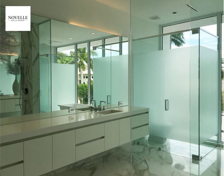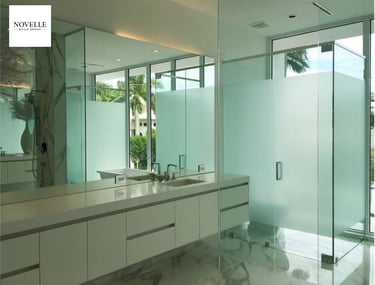 This sleek, light-filled bathroom remodel by Novelle Build Group blends modern architecture with refined finishes. Featuring custom frosted glass partitions, full-height windows, and polished stone flooring, the space is designed to feel open yet private.