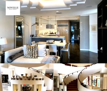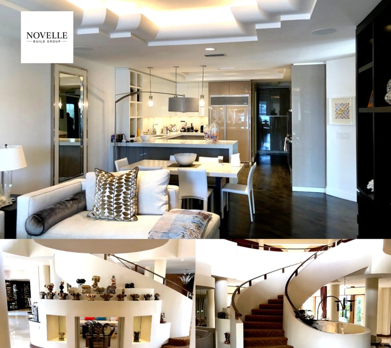 Full interior modernization including structural stair reshaping, ambient ceiling refinish, and complete kitchen rebuild. Removed dated textures, reframed decorative lighting recesses, and installed custom wood flooring. Sculpted staircase retreaded and handrail reset to meet updated rise/run specs. Kitchen reimagined with slab cabinetry, integrated appliances, and designer pendant lighting. Trimless outlets, in-ceiling audio, and flush LED systems installed throughout. Executed across 4 zones in sequence for uninterrupted client occupancy. Zero change orders.