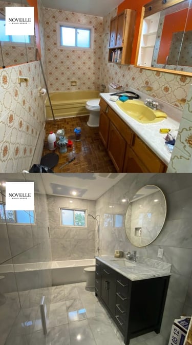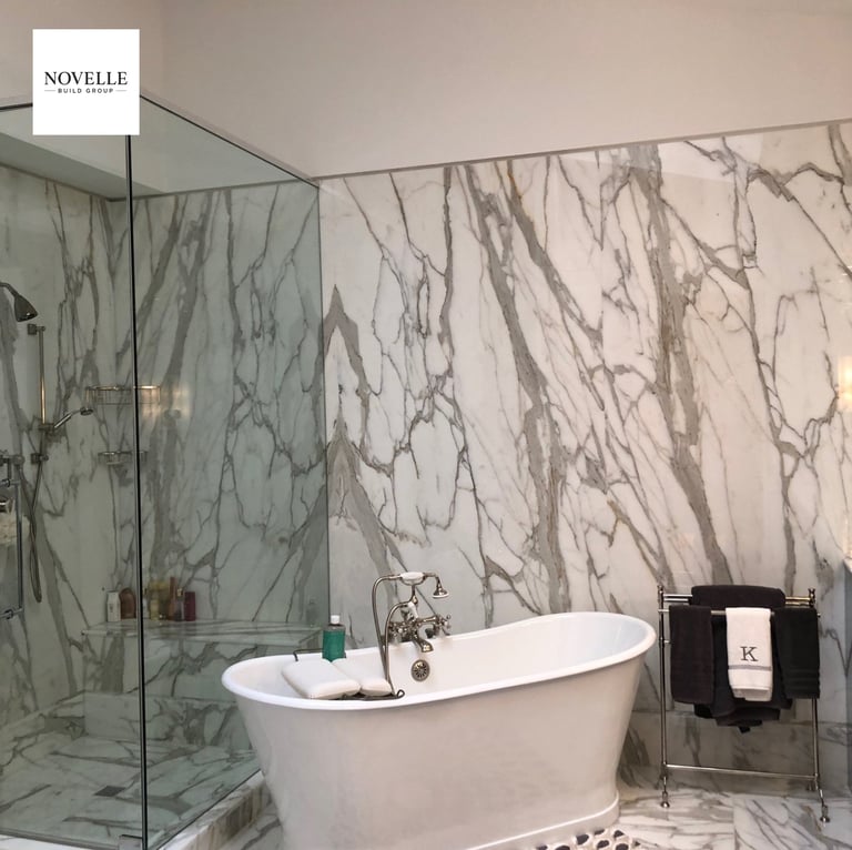 This bathroom remodel by Novelle Build Group showcases timeless elegance with dramatic full-slab marble walls, a seamless glass walk-in shower, and a freestanding soaking tub as the centerpiece.